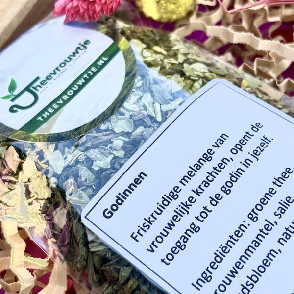 - Bio thee ‘Love’: groene thee, vrouwenmantel, salie, goudsbloem en bergamotaroma.