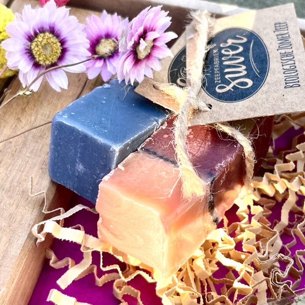 - 2 biologische handgemaakte zeepjes ‘stoer’ en ‘zomer’ van Zeepfabriek Suver