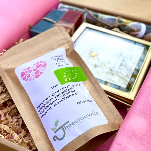 - Biologische thee ‘Love’: groene thee, groene jasmijnthee, hennepblad, rozenbloesem, natuurlijke bergamot- en vanillearoma's.