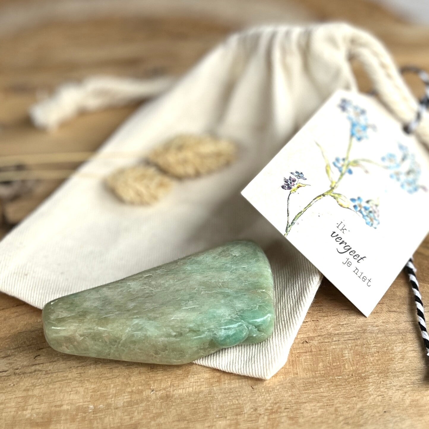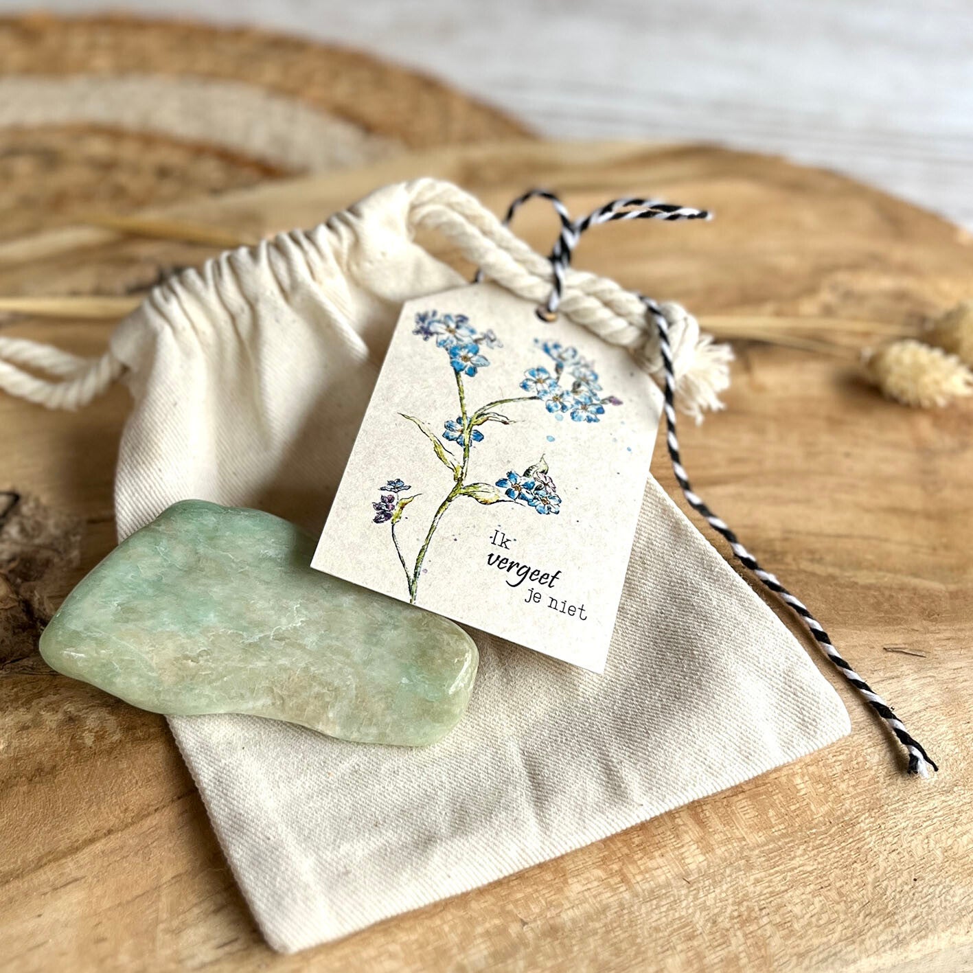 Een katoenen zakje met een mooi stukje Amazoniet en een vergeet-mij-nietjes label eraan met de tekst "Ik vergeet je niet". Wordt verstuurd als een echt brievenbuscadeautje.