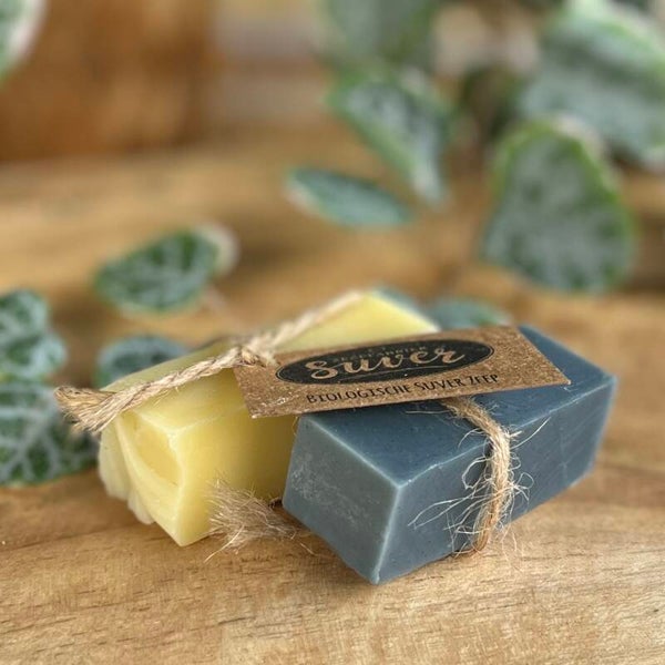 - 2 biologische handgemaakte zeepjes ‘stoer’ en ‘suver’ van Zeepfabriek Suver