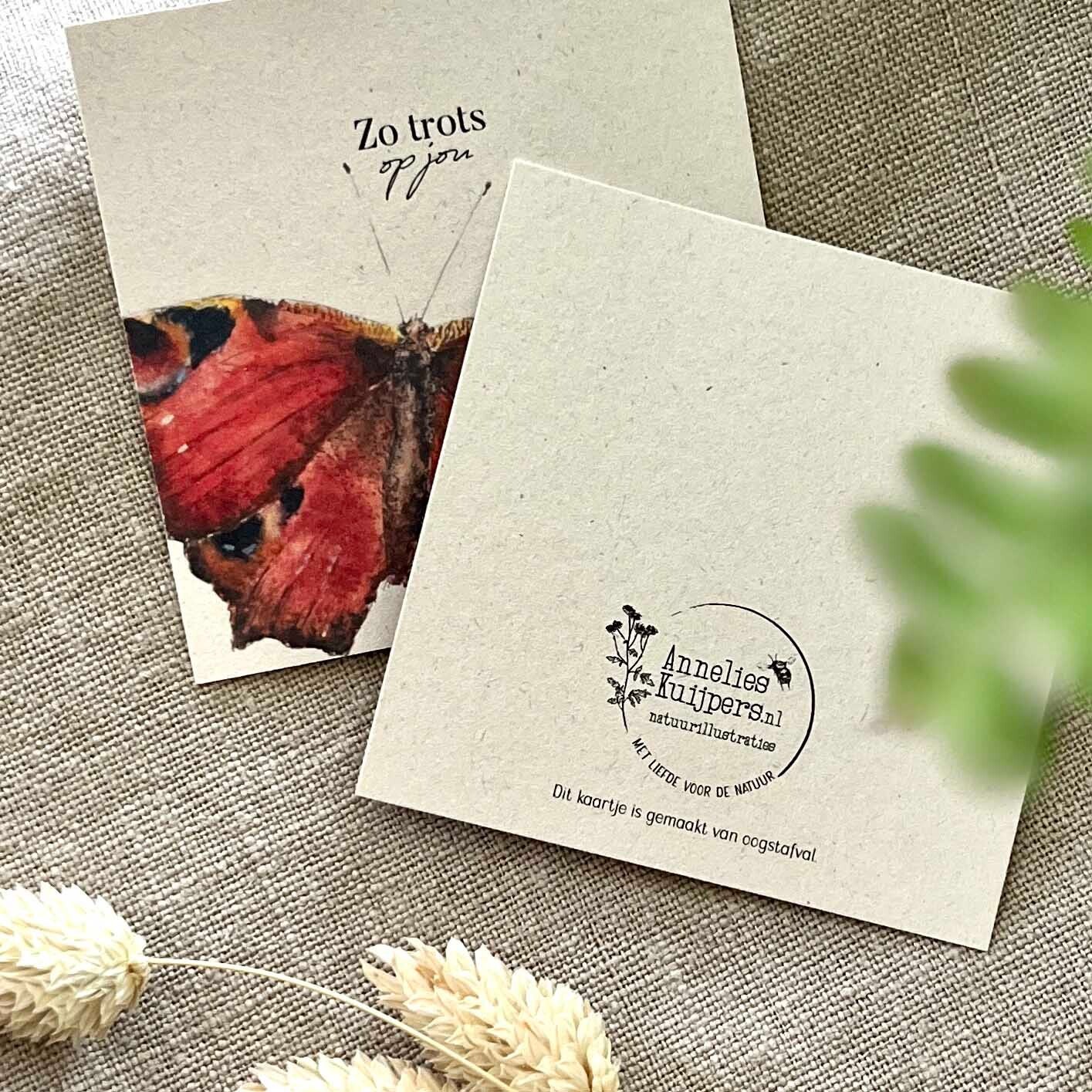 De kaarten laat ik drukken op super duurzaam papier. Gemaakt van bladeren en stengels die overblijven na de oogst. Dat is nóg mileuvriendelijker dan gerecycled papier! Geproduceerd met 100% groene energie. Daar word ik nou blij van!