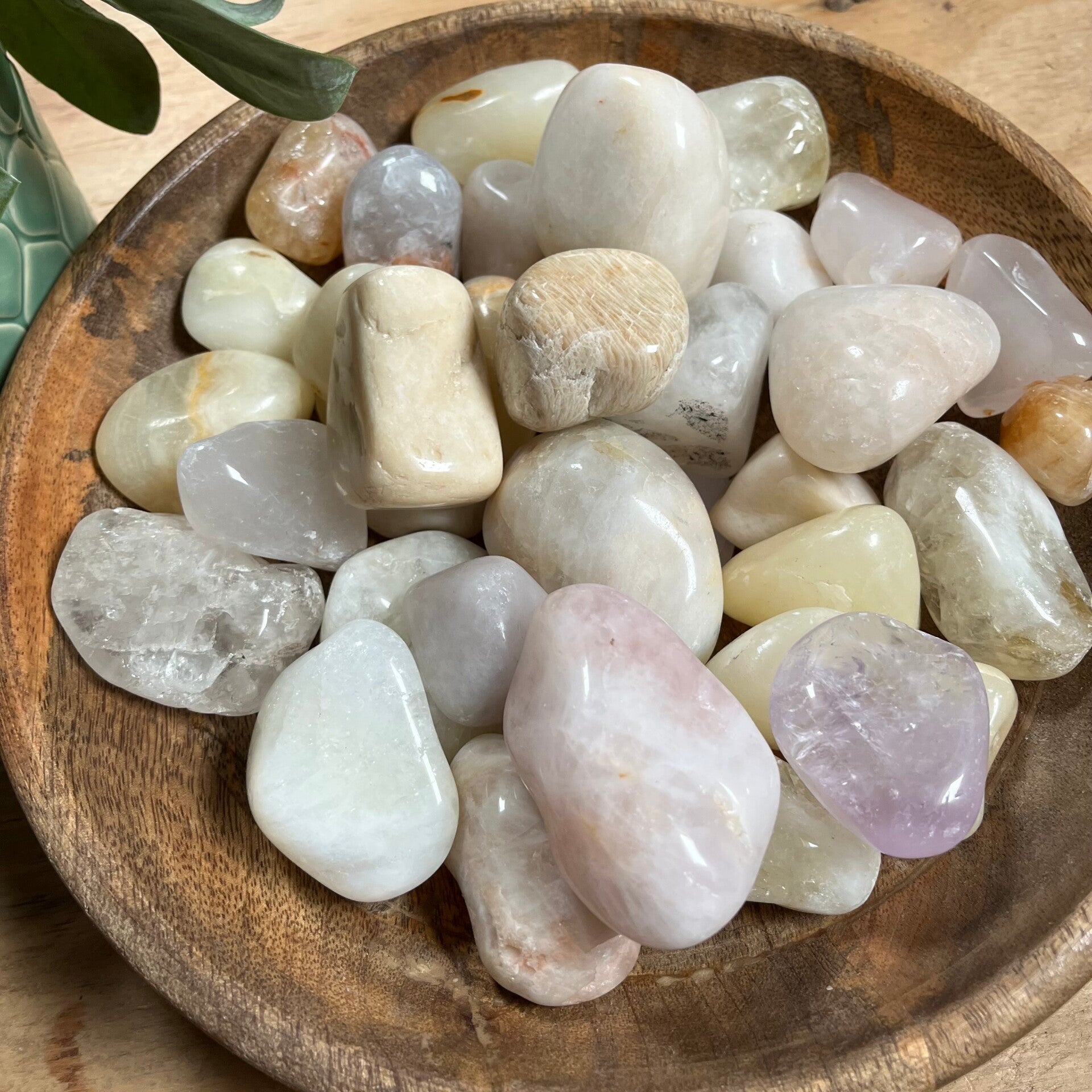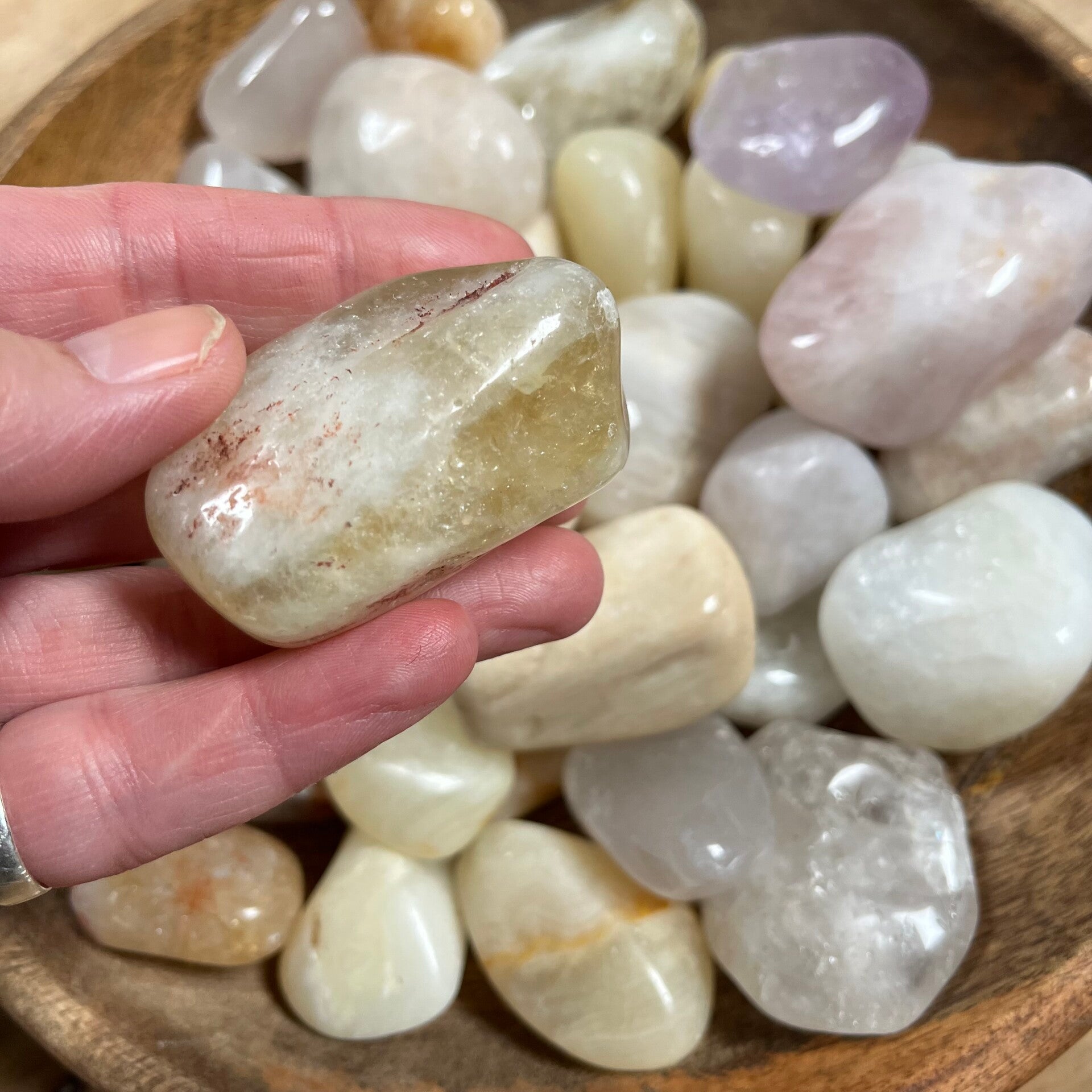 Allerlei verschillende stenen. O.a. veldspaat, melkkwarts, rozekwarts. Ik moet er vanaf en teveel werk om precies uit te zoeken wat wat is 😉 Ik zag soms ergens een klein stukje vanaf.