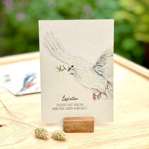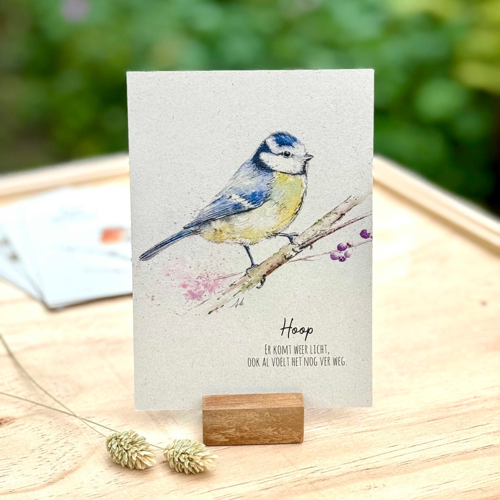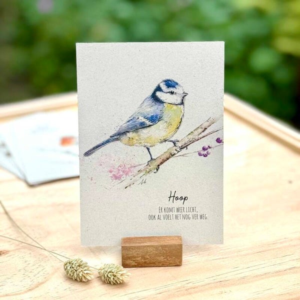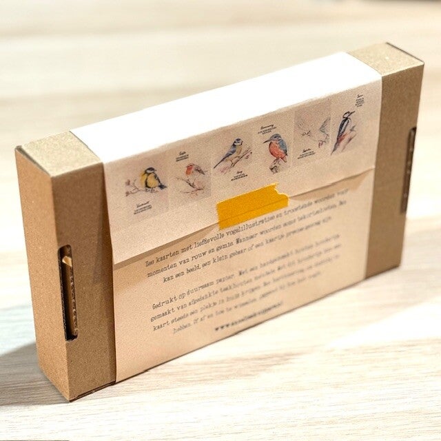 - 6 kaarten (A6) met vogelillustraties en troostende teksten (10,5 x 14,8 cm)