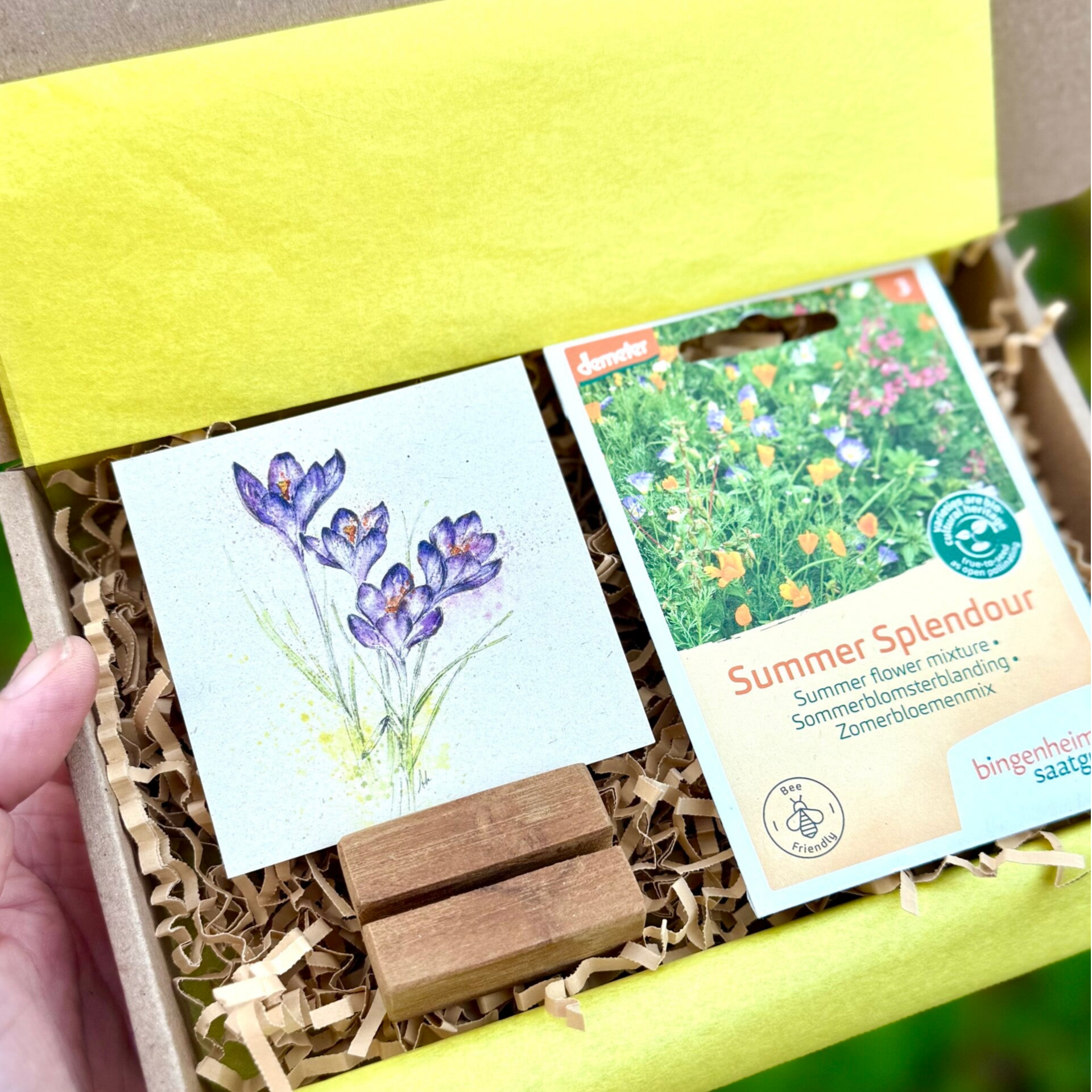 Met aandacht en liefde is dit brievenbuscadeautje samengesteld. Een origineel en vrolijk setje voor in het voorjaar. Geniet van de krokussen en zaai de zomerbloemen in april/mei.