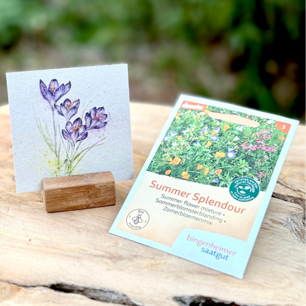 - Duurzaam mini-kaartje met krokussen en handgemaakt teakhouten houdertje;