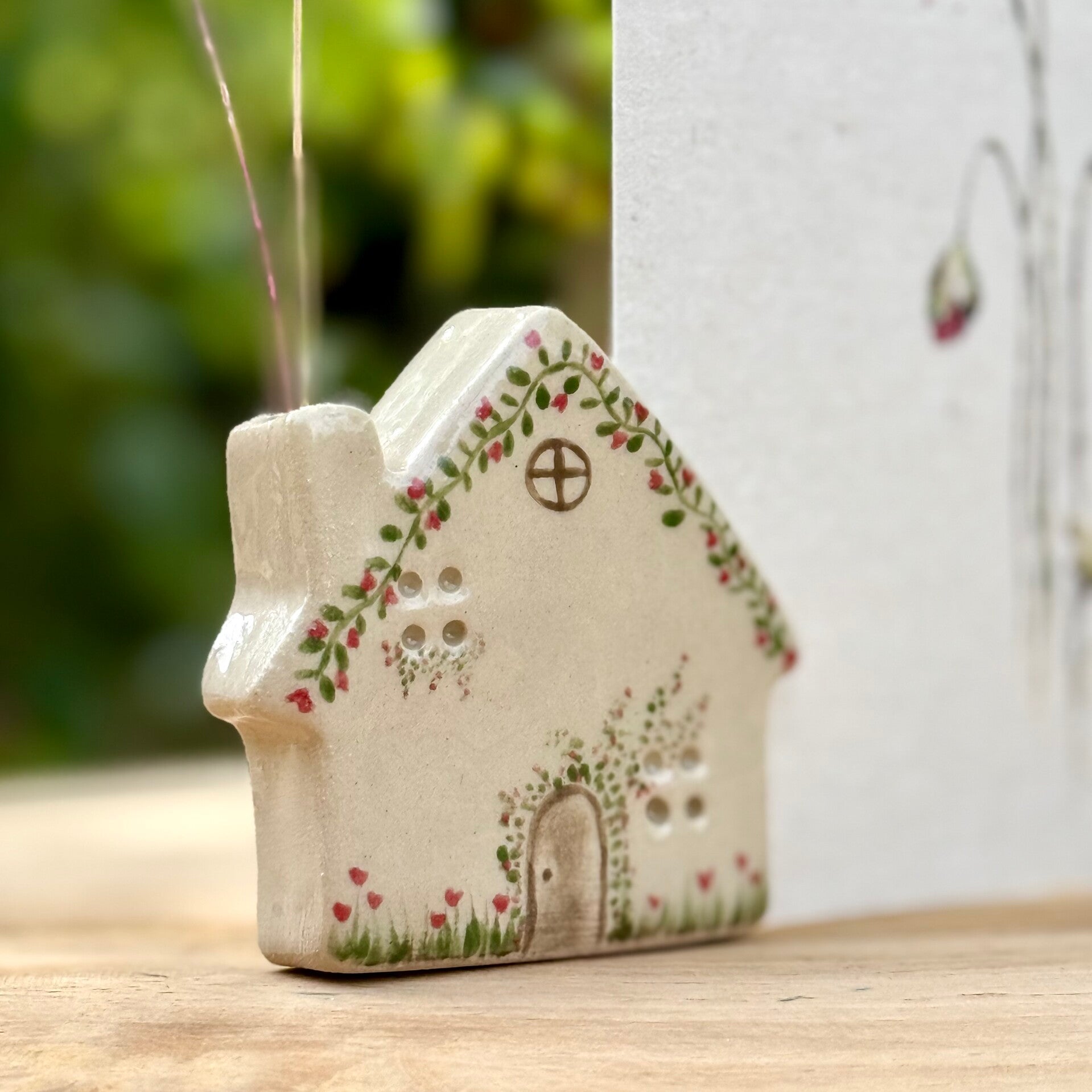 Dit lieve keramieken huisje is met de hand gemaakt en beschilderd door Elsanne Bijma van Klaaiguod, en wordt geleverd als compleet setje met mijn bijpassende ansichtkaart.
