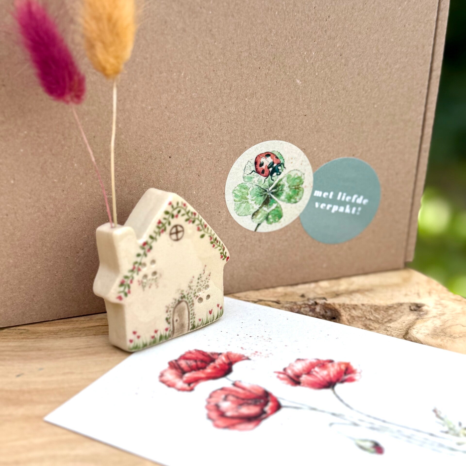 Huisje met droogbloemetjes & klaprooskaart