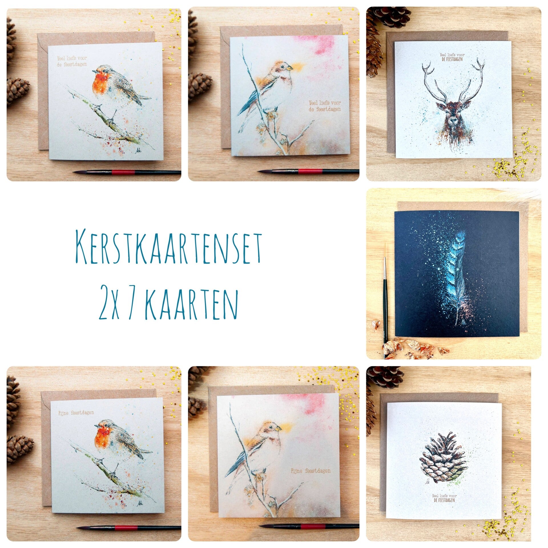 Set met 14 duurzame kerstkaarten, 2 stuks per kaart.
