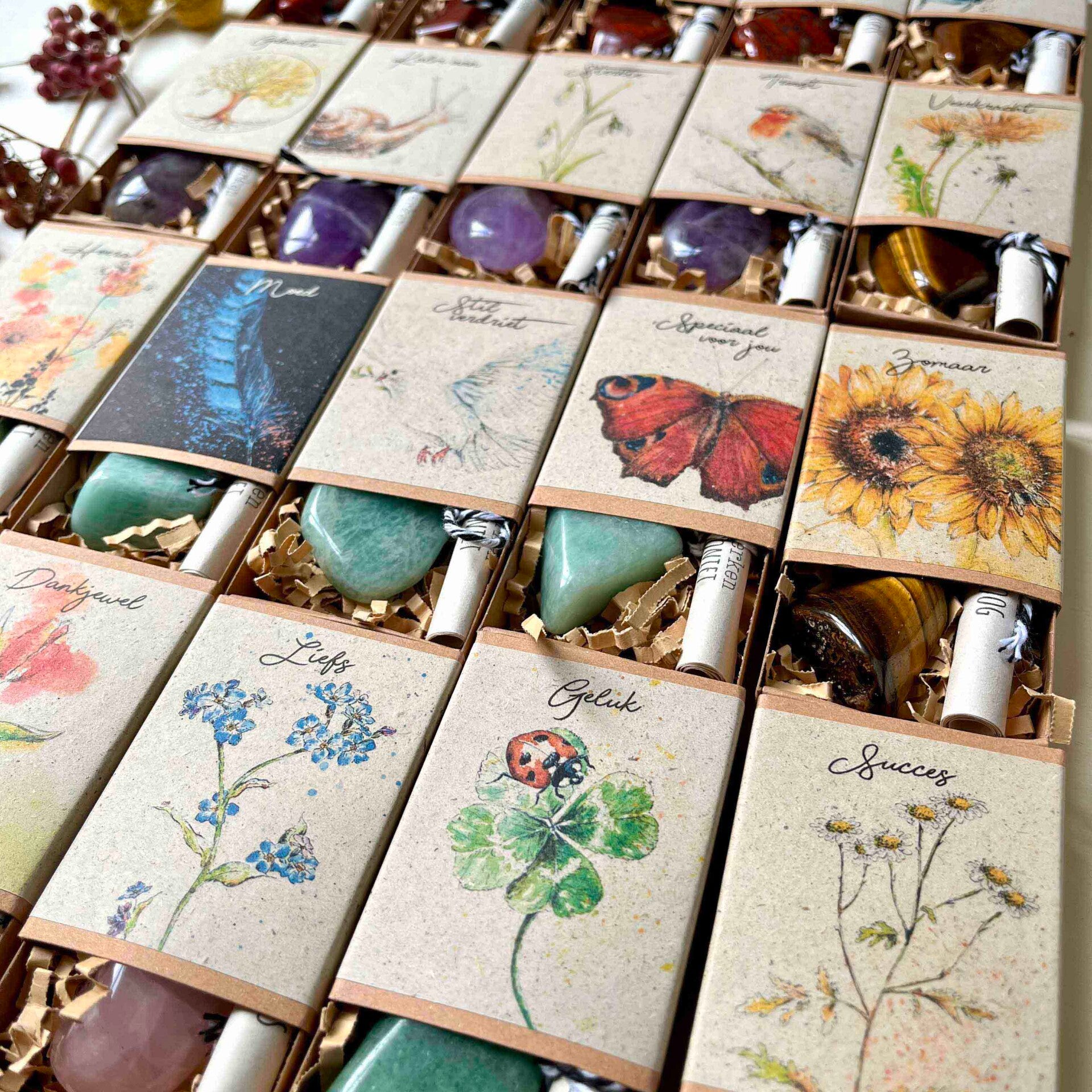 *De kenmerken van alle mineralen en edelstenen in deze doosjes zijn niet wetenschappelijk bewezen; ze zijn gebaseerd op ervaringen van gebruikers en edelsteentherapeuten. De geschetste heilzame eigenschappen zijn op geen enkele wijze bedoeld om de diagnose of behandeling door een gekwalificeerde therapeut of arts te vervangen. Als u twijfelt over uw gezondheid, raadpleeg dan een arts.